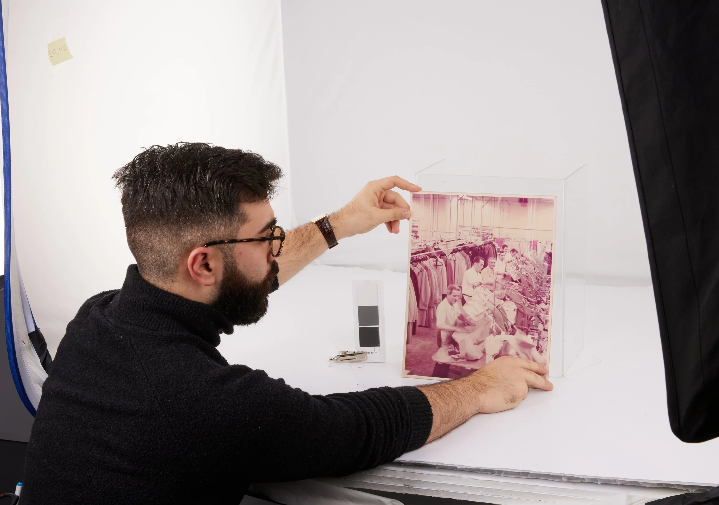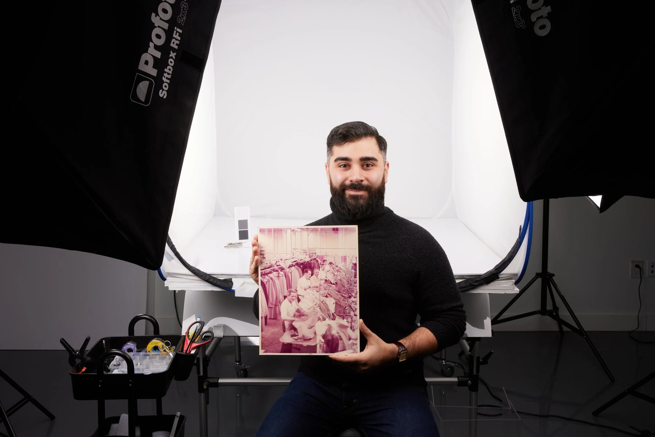 La façon la plus simple et rapide de numériser votre image est d'en prendre une photo. Vous pouvez utiliser votre appareil mobile ou autre. Toutefois, la qualité de l'image dépendra de la qualité de votre appareil et des lentilles que vous allez utiliser : soyez avertis! Trouvez un endroit chez vous où la lumière est indirecte afin d'éviter des reflets sur vos photos, surtout lorsque le papier est glacé. Une fois que c'est fait, ajuster le cadre (crop) afin de garder ce que vous voulez soit avec les outils d'édition de vos appareils mobiles ou dans le logiciel de votre choix . Pour cet article, la photo de mon grand-père en exemple a été numérisée en studio à l'aide de 4 têtes de flash profoto, d'une canon R5, et d'une lentille 200 mm, mais j'aurais pu faire le tout avec mon Iphone 13.